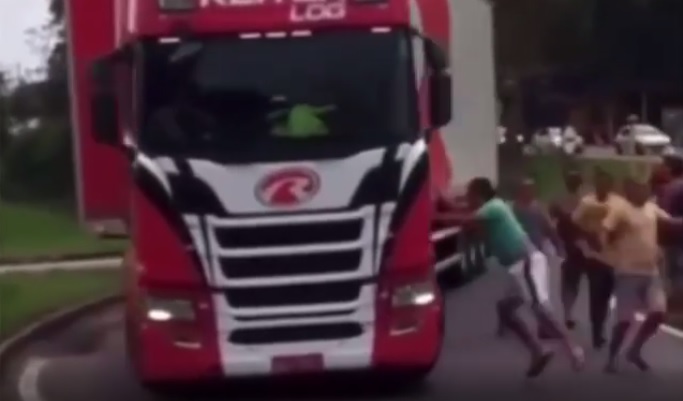 Um vídeo divulgado na internet mostra caminhoneiros tentando destruir o veículo, enquanto o motorista foge.