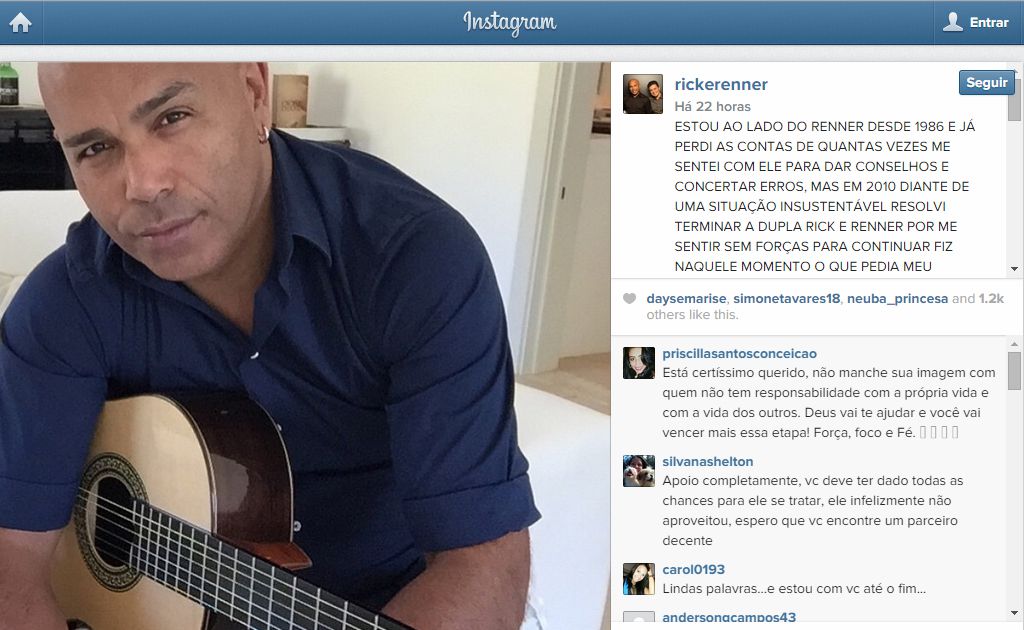 “Estou ao lado do Renner desde 1986 e já perdi as contas de quantas vezes me sentei com ele para dar conselhos e concertar erros, mas em 2010 diante de uma situação insustentável resolvi terminar a dupla Rick e Renner por me sentir sem forças para continuar fiz naquele momento o que pedia meu coração, com uma carreira solo em andamento resolvi dar ouvidos a pessoas ligadas a Rick e Renner assumi ao lado dele a responsabilidade por problemas que não tive nada a ver por amor à música e aos fãs ,passei por cima dos meus princípios dos ensinamentos do meu pai e dei ouvidos a tudo que me disseram e acreditei na mudança do ser humano, planejei o futuro apostei mais uma vez acreditei mesmo que eu estava errado mas novamente vejo tudo que construir ser jogado fora diante dos meus olhos com os últimos acontecimentos.