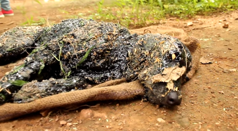 Os socorristas precisaram usar óleo vegetal para tirar todo o piche do pelo do animal. O processo durou três dias.