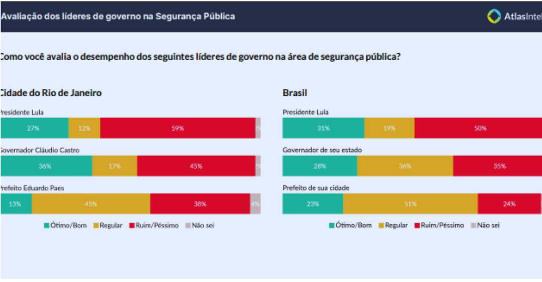 A nível nacional, a reprovação de Lula na Segurança cai para 50%, enquanto a dos governadores é de 35% e a dos prefeitos, 24%.