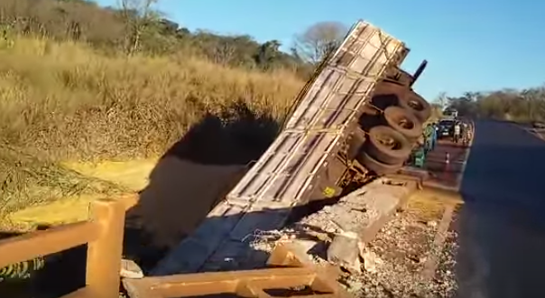 Uma carreta carregada com milho a granel colidiu com o guarda corpo de uma ponte e caiu no Ribeirão Sarandi, no km 177 da BR 452, no início da manhã desta quarta-feira (12),  em Itumbiara.