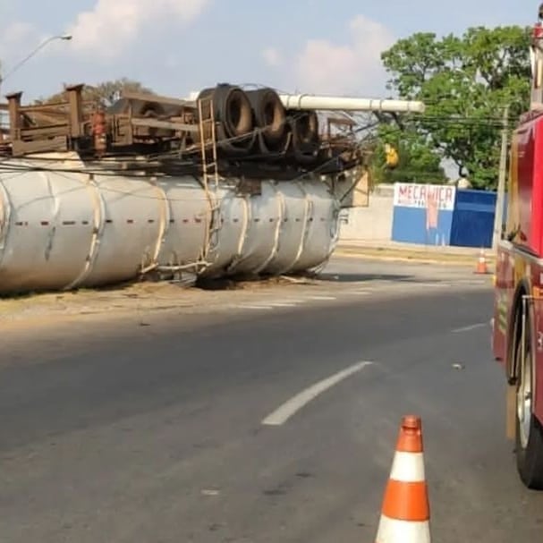Na tarde desta 2ª feira (27), um caminhão de líquido inflamável capotou em Aparecida de Goiânia, ao tentar realizar uma curva acentuada em uma via da cidade.