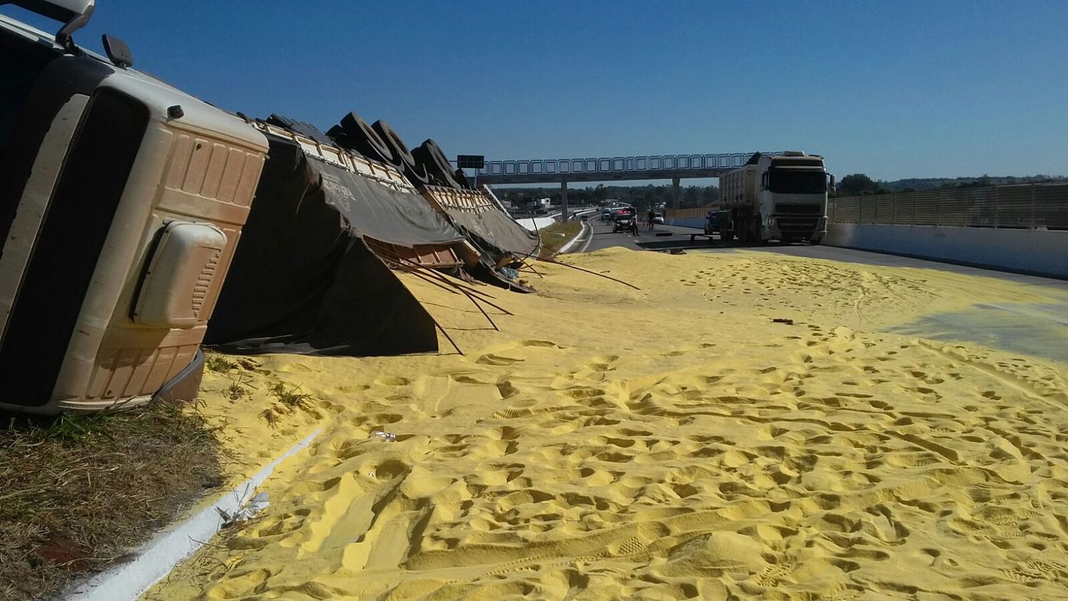 A pista deve ser liberada no começo da noite, após o recolhimento da carga espalhada e a remoção da carreta. O motorista não sofreu ferimentos.