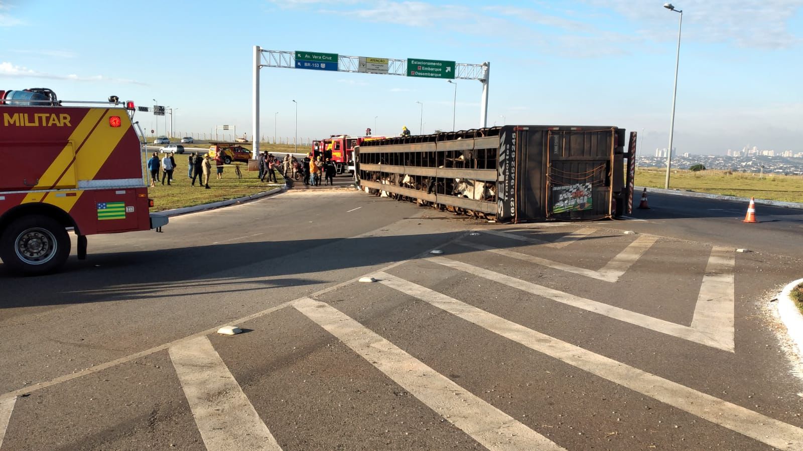 Uma carreta com 75 bois tombou na alameda Aeroporto, no Jardim Guanabara, próximo ao Aeroporto Internacional Santa Genoveva.