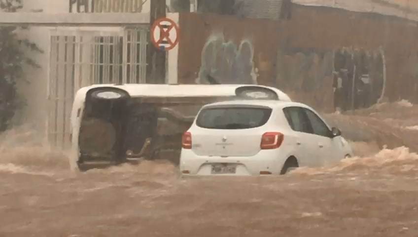 Um carro capotou e foi arrastado no meio da Av. 85, em Goiânia, após forte temporal que atingiu a cidade na tarde desta quinta-feira, 5.
