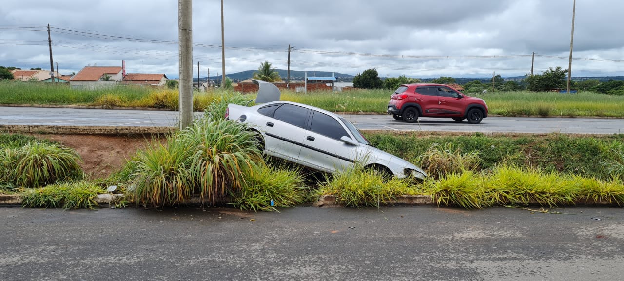 Carro vai parar em vala da GO-040, em Goiânia, após condutor perder o controle