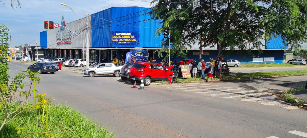 O Ford Ecosport vermelho teve os 2 airbags acionados e sua parte frontal ficou bastante danificada.