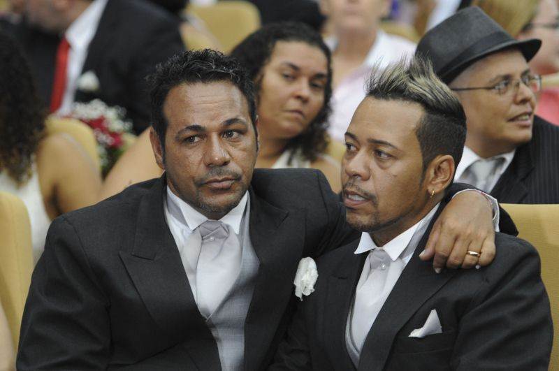 O casal Marcos da Costa e Josué dos Santos, que está junto há 12 anos, foi à cerimônia buscando o reconhecimento do Estado e os direitos que o casamento proporciona, como a facilidade de ter conta conjunta, ser dependente em plano de saúde e ter direito à herança sem a necessidade de um testamento. Para eles, o preconceito está diminuindo. “O casamento e a família são instituições importantes na vida da gente. Nunca nos separamos e criamos meu filho biológico juntos. Hoje, nosso neto está aqui”.