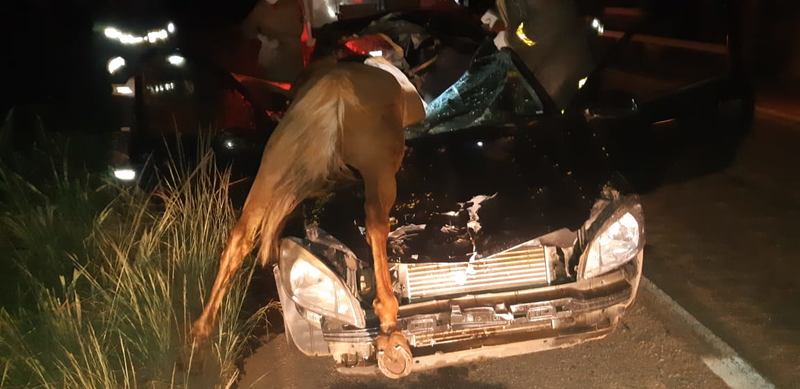 Com o impacto, o cavalo morreu ao quebrar o para-brisa e invadir o interior do veículo, atingindo também a vítima.