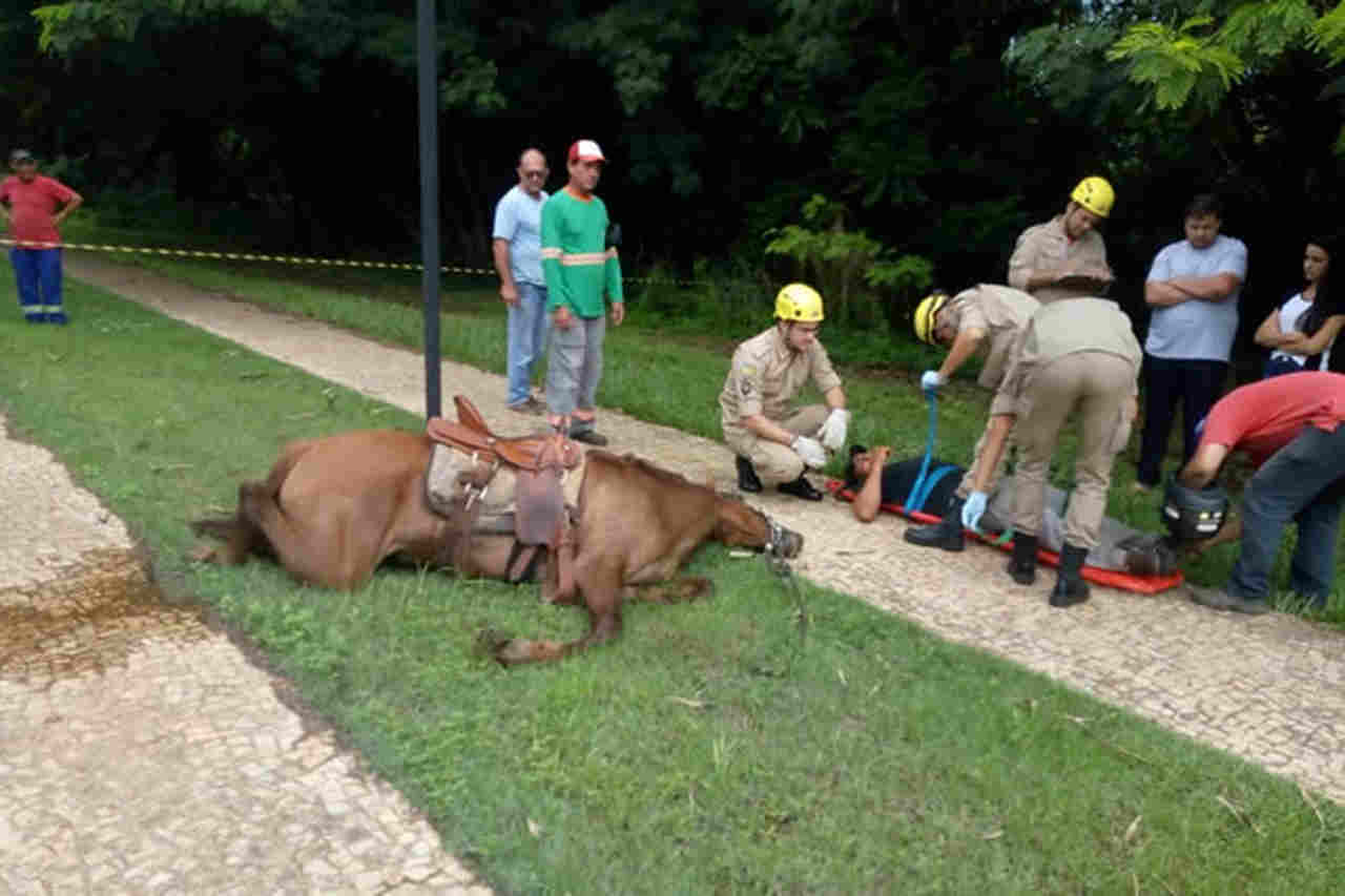 Chegando ao local, uma praça no bairro Santa Luzia, os militares se depararam com o cavalo já sem vida e o homem caído no chão.