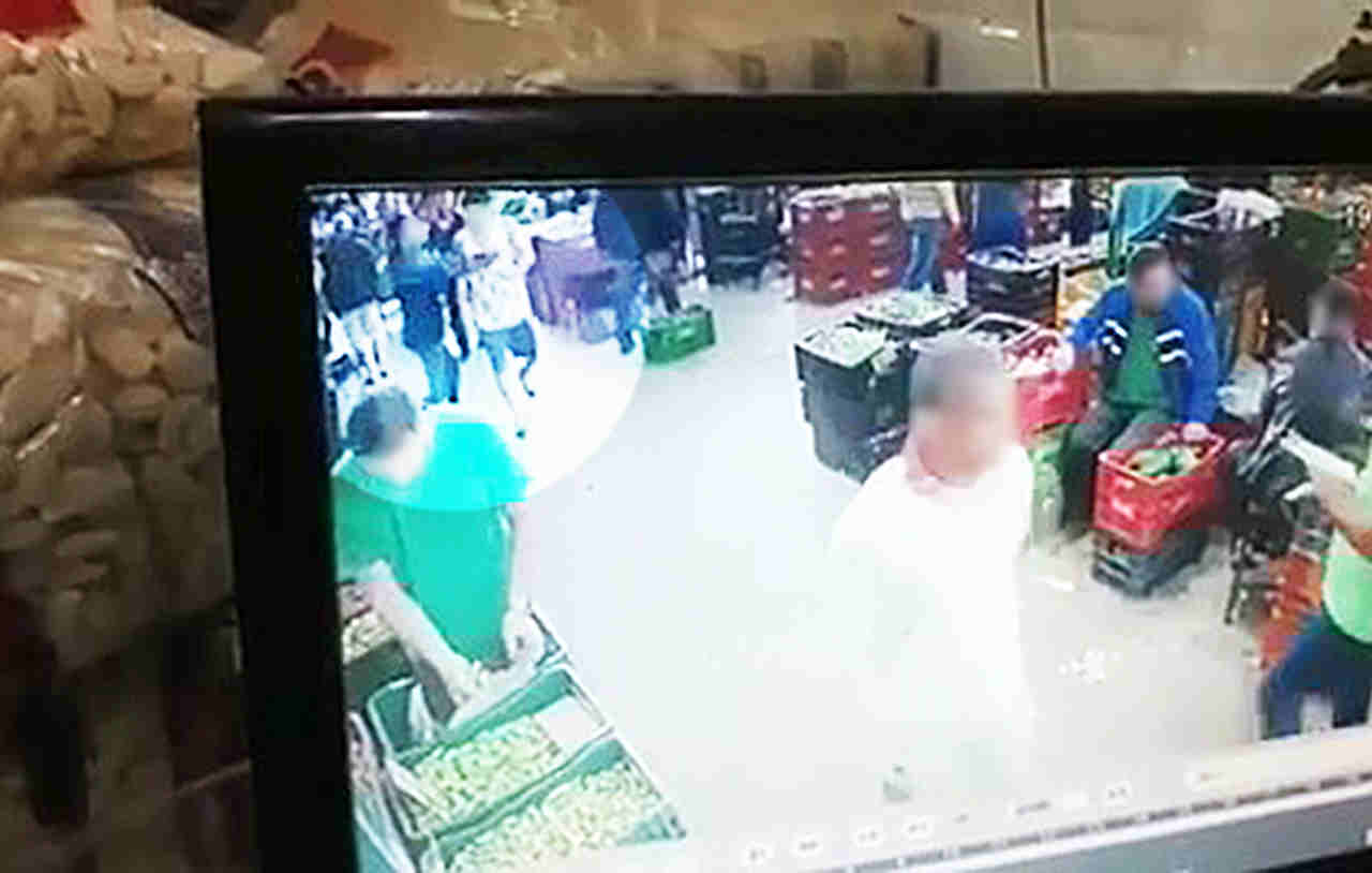 Nas imagens, é possível ver a vítima caminhando entre caixas de alimentos quando é surpreendida por um homem usando uma blusa de frio.