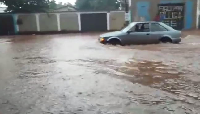Chuva deixa rua alagada e carro tem dificuldade para atravessar