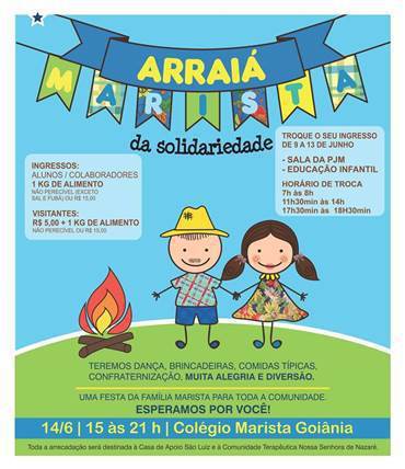 O Colégio Marista Goiânia realiza neste sábado, 14, das 15h às 21h, o Arraiá Marista da Solidariedade. A entrada custa R$ 5 mais 1 kg de alimento, ou R$ 15.