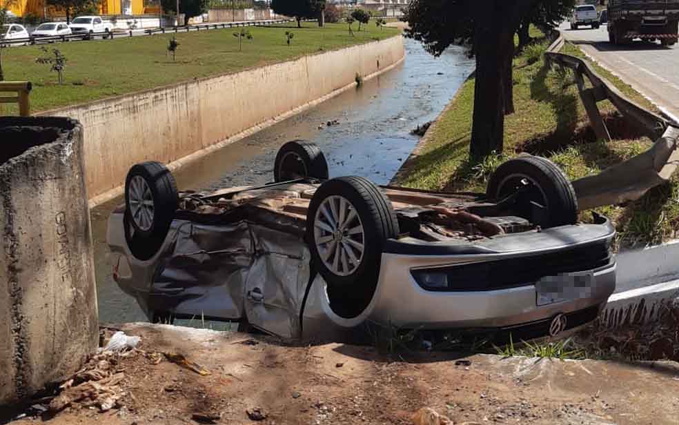 No acidente entre um Onix e um Voyage, o segundo veículo capotou e quase caiu dentro do córrego Cascavel.