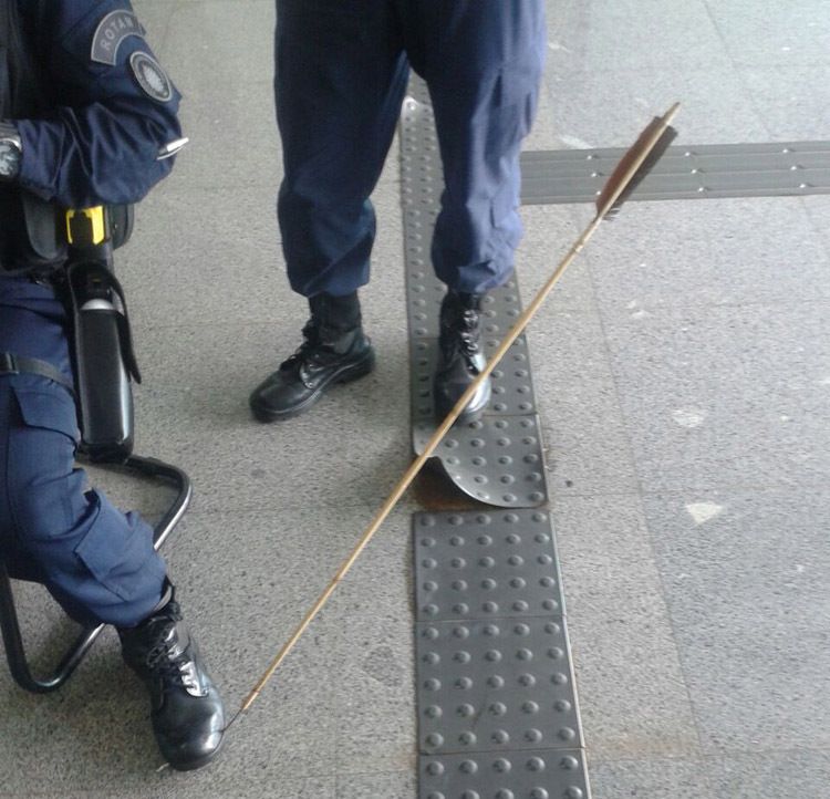 A Polícia Militar do Distrito Federal usou bombas de gás lacrimogêneo para impedir a entrada dos protestantes no Palácio do Planalto. Um policial foi atingido por uma flecha, que só atravessou a borracha da sua bota.