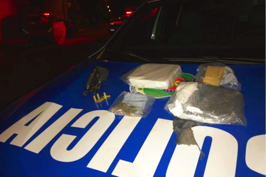 Na residência, substâncias análogas à maconha e à cocaína foram apreendidas, além da arma de fogo de calibre 38.
