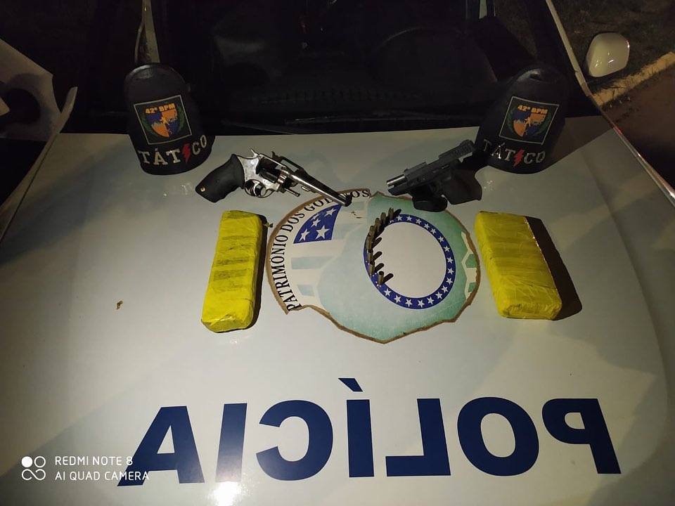Com o quarteto, a polícia apreendeu 2 tabletes de maconha e 2 armas de fogo, sendo 1 revólver calibre 38 e 1 pistola .40, além do veículo recuperado.