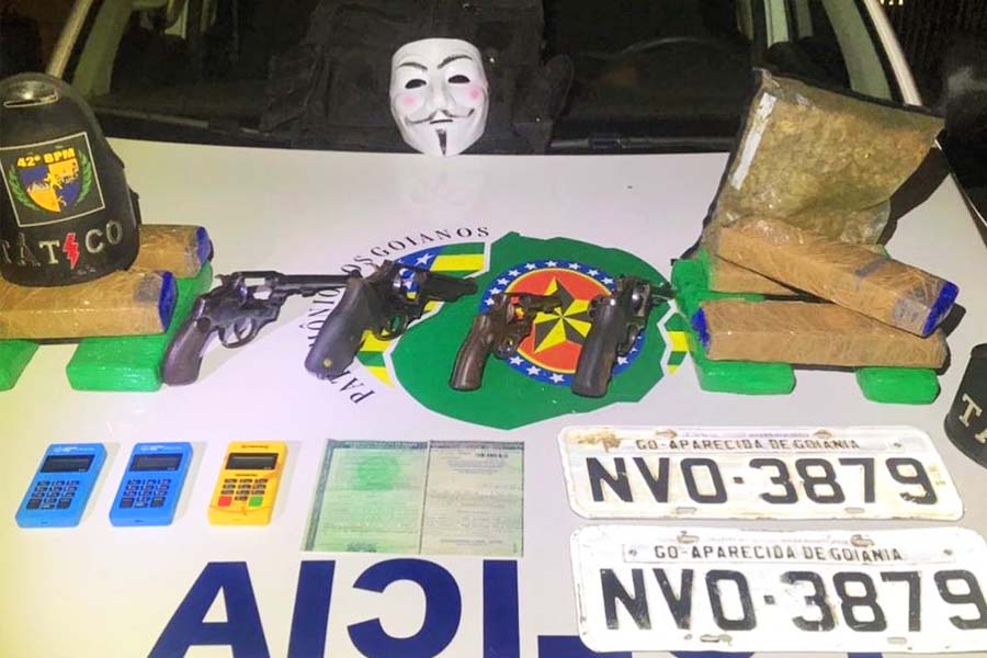 Na residência, foram apreendidos 9 peças de maconha, 1 pacote de Skunk, balança de precisão, máquinas de cartão de crédito, máscara de palhaço, capa de colete balístico, documento e placas de outro veículo produto de roubo, além das 4 armas de fogo utilizadas pelos suspeitos.