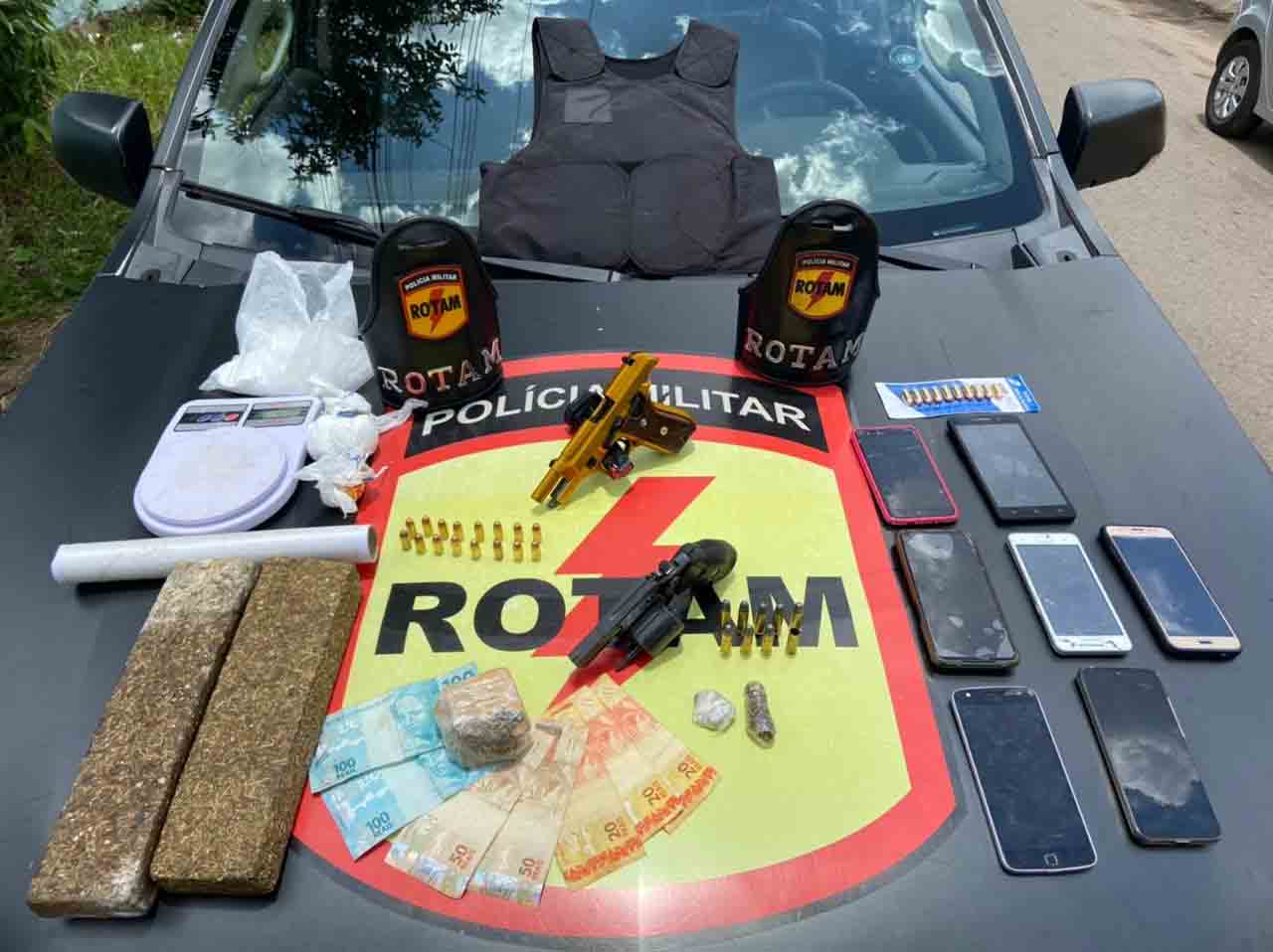 Foram apreendidas 1 pistola calibre 380, 1 revólver calibre 38, 8 munições calibre 38, 1 colete balístico com numeração suprimida, cerca de 3kg de maconha, porções de cocaína, balança de precisão, 7 aparelhos celulares e R$360 oriundos do tráfico.