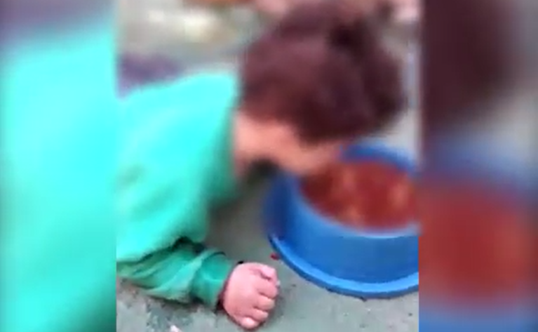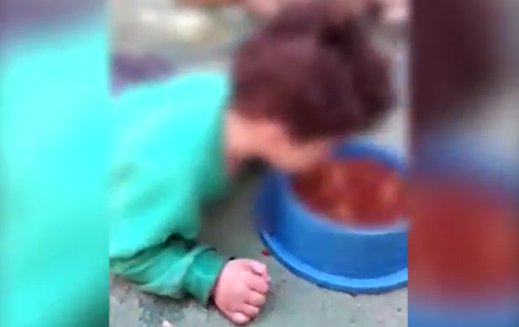 Nas cenas, a criança aparece deitada no chão aparentemente comendo ração de um cachorro da família.