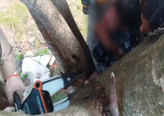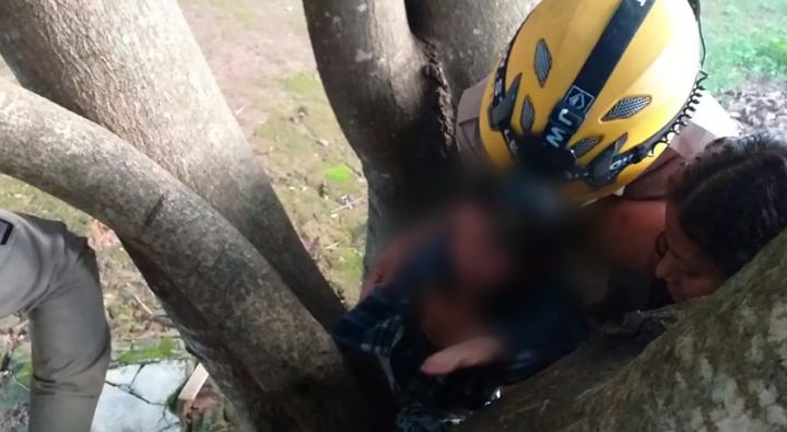 Os bombeiros precisaram cortar um dos galhos da árvore para remover a criança.