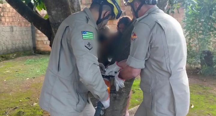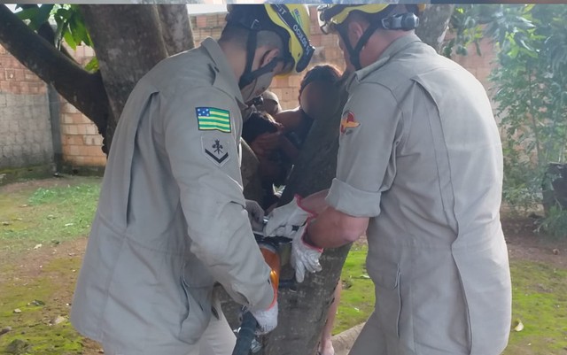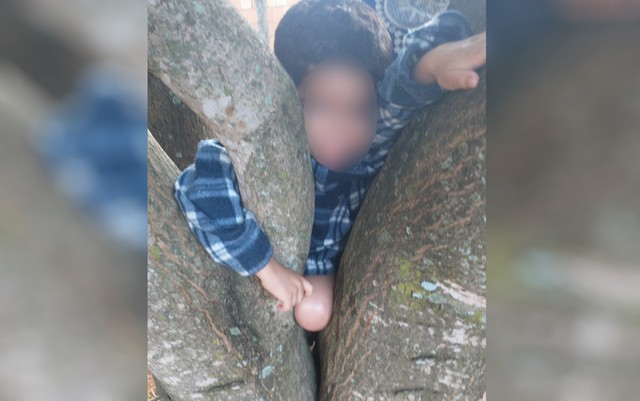 Uma criança de 3 anos ficou presa em uma árvore na tarde desta 2ª feira (15), em Luziânia, no Entorno do Distrito Federal.