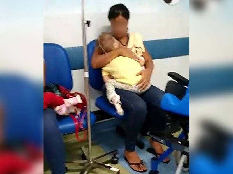 Devido à superlotação da unidade, porém, a criança teve que ficar no colo da mãe em uma cadeira na sala de espera enquanto recebia o tratamento prescrito.