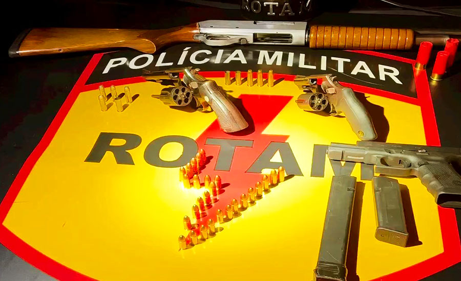 Com eles, foram apreendidas 1 pistola Glock kit rajada 9 mm; 1 Gauge calibre 12 e 2 revólveres calibre 38.