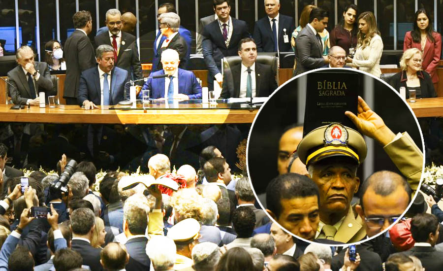 Chamou a atenção de quem acompanhava a posse do presidente Lula nesse domingo (1º) a presença de uma homem de farda, enrolado em uma bandeira de Israel e levantando uma Bíblia aberta sobre a cabeça.