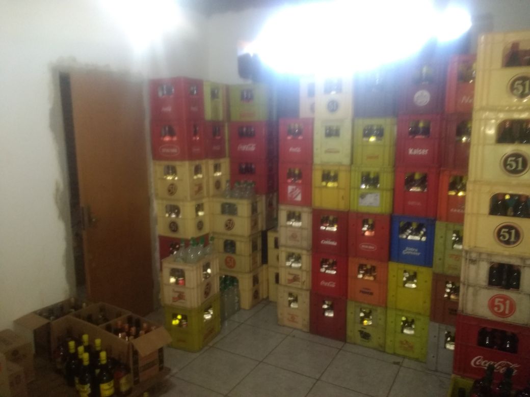 Foram encontradas armazenadas centenas de garrafas vazias, grande quantidade de bebidas diversas, principalmente aguardentes em caixas e engradados, todas aparentemente em condições de consumo.