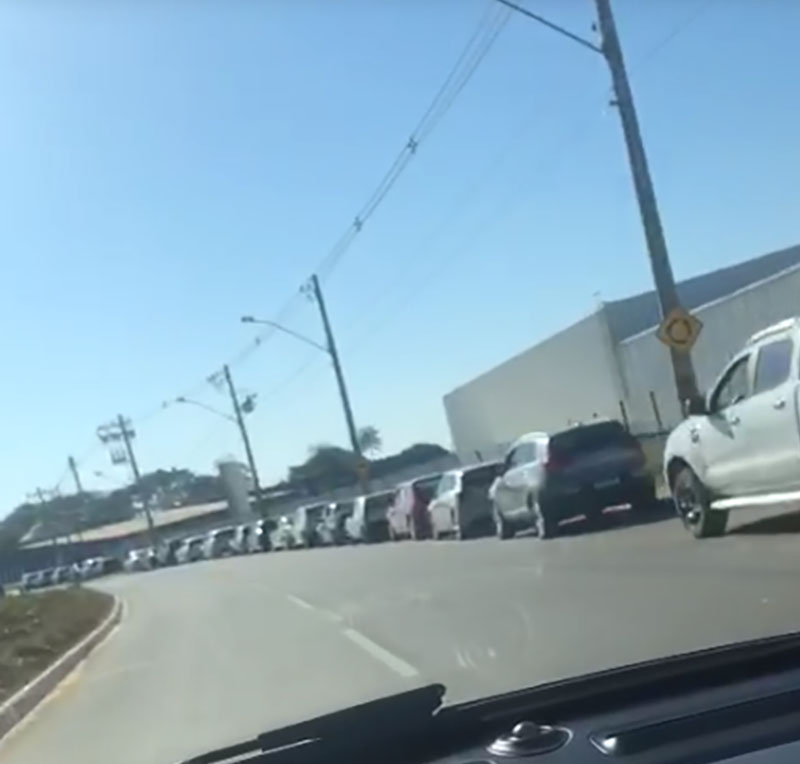 O drive-thru de vacinação contra a Covid-19 da Prefeitura de Aparecida amanheceu neste sábado (10) com uma fila de cerca de 3km de carros.