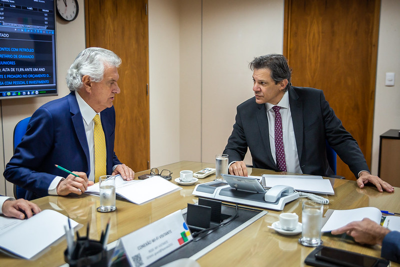 O governador Ronaldo Caiado (União Brasil) se reuniu nesta 4ª feira (17) com o ministro da Fazenda, Fernando Haddad (PT), em Brasília.