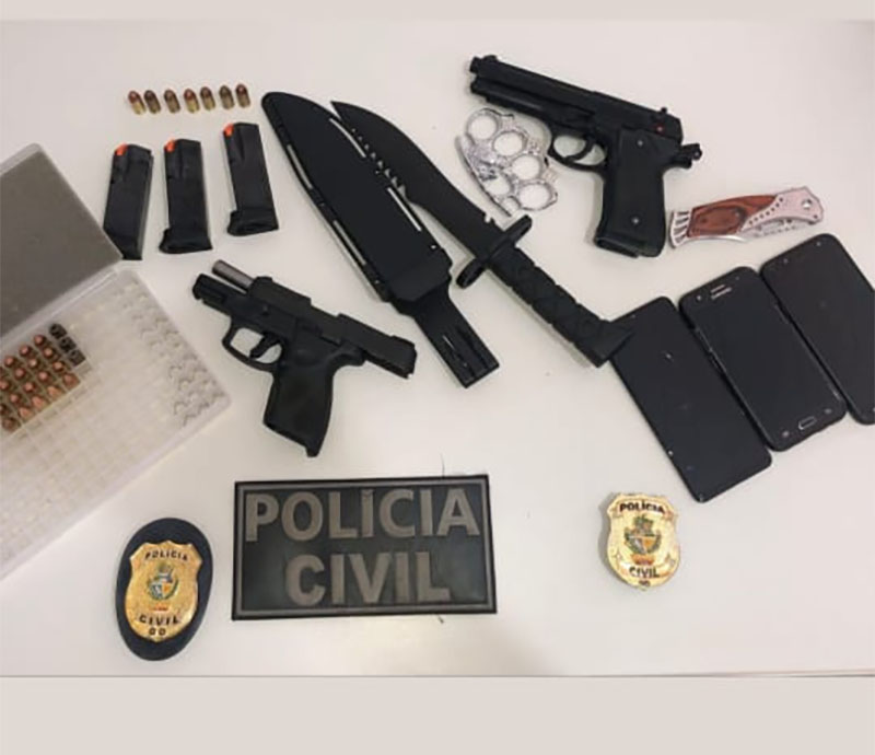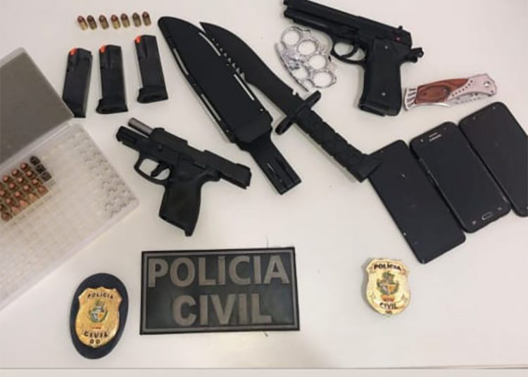 Em foto divulgada no perfil da 8DRP, mostra que a PC apreendeu armas de fogo, munições, facas, celulares e um soco inglês.