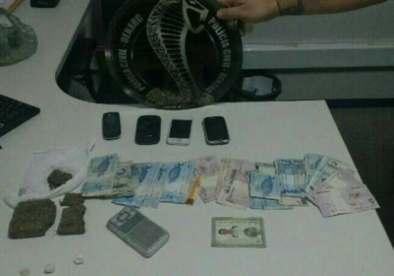 Com os suspeitos, os policiais apreenderam porções de maconha, crack, dinheiro e até uma balança de precisão.
