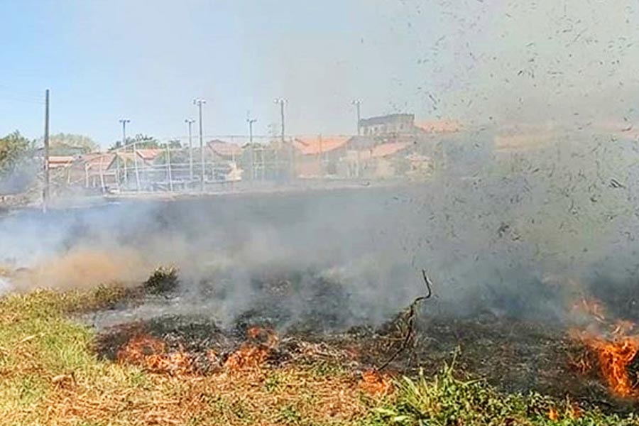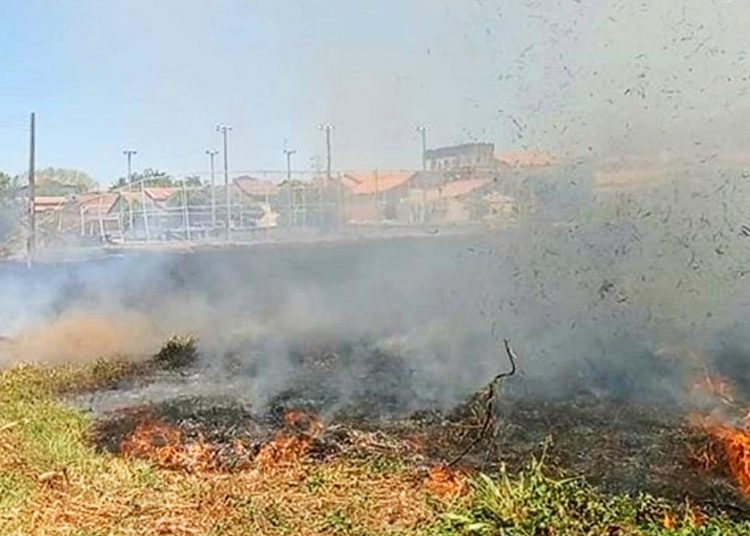 Dois homens em uma moto foram flagrados ateando fogo em um lote baldio na Avenida Ipiranga, no setor Serra Dourada, em Aparecida de Goiânia.