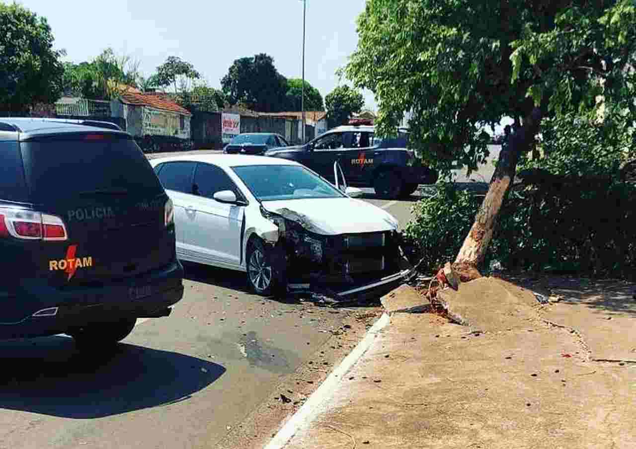 Houve perseguição e, em um determinado momento, o homem perdeu o controle do carro e bateu em uma árvore.
