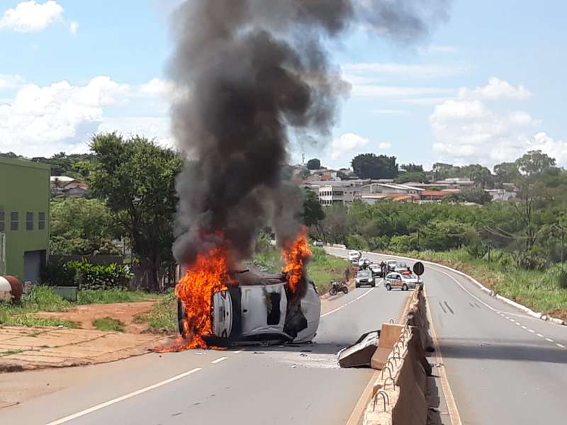 Foi então que o carro colidiu contra a mureta de proteção da via, capotou e pegou fogo.