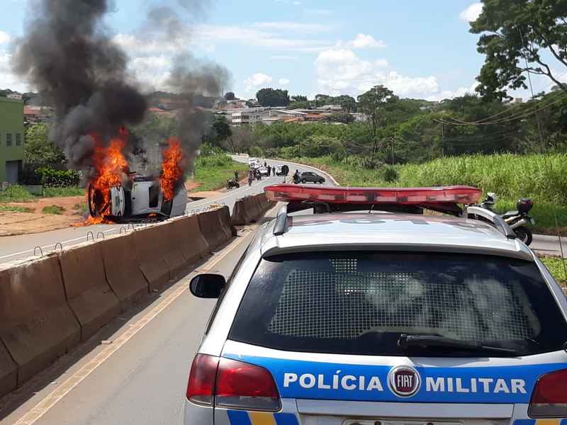 Foi então que o carro colidiu contra a mureta de proteção da via, capotou e pegou fogo.