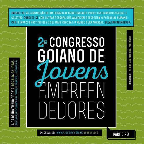 A Associação de Jovens Empreendedores e Empresários de Goiás (AJE Goiás), em parceria com a Faculdades Alfa, o Governo do Estado de Goiás, por meio da Secretaria de Estado de Indústria e Comércio e o Sebrae Goiás, realiza nesta quinta-feira, 6, e sexta-feira, 7, no auditório da Faculdades Alfa, em Goiânia, o 2º Congresso Goiano de Jovens Empreendedores. O congresso é voltado para proporcionar um ambiente favorável para aquisição de práticas inovadoras, que poderão agregar positivamente no desenvolvimento de negócios, além de promover um encontro produtivo entre jovens empreendedores, lideranças políticas e empresariais de Goiás e do Brasil.