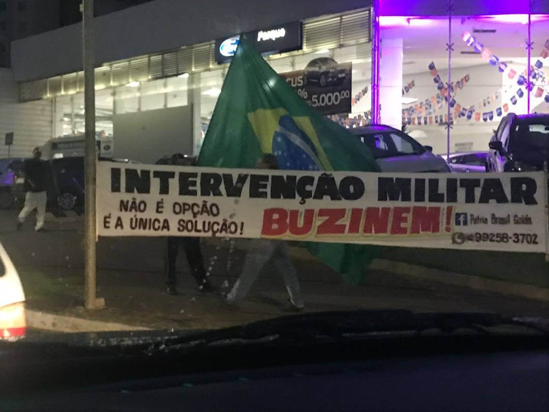 Uma faixa exposta na Avenida 85, em Goiânia, chamou a atenção de quem passava pelo local na noite da última quarta-feira, 4. “Intervenção militar não é opção, é a única solução”, declarava a manifestação.