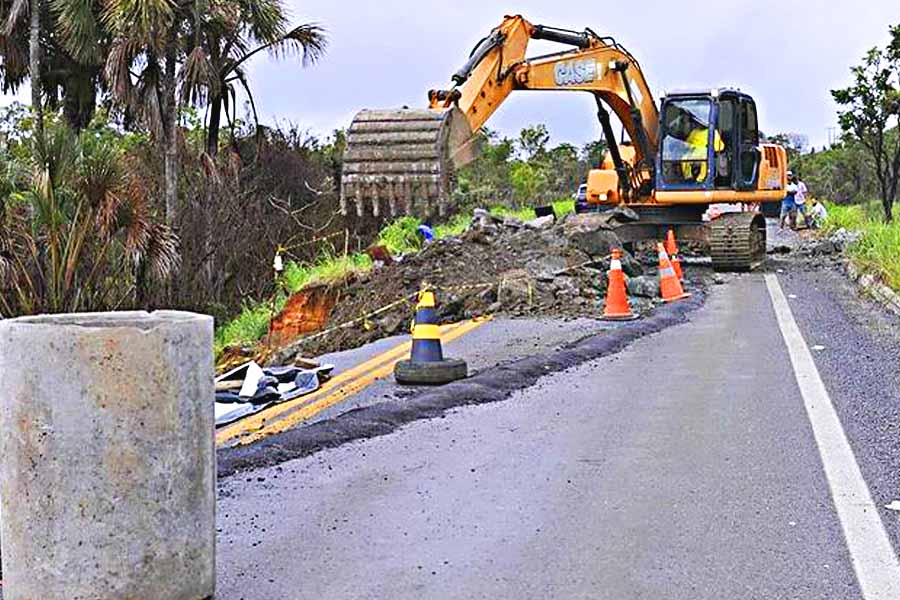 Trecho entre Alto Paraíso e Teresina de Goiás estava totalmente interditado após uma erosão no leito da via. Cerca de 30 caminhões estão empregados nas obras de recuperação