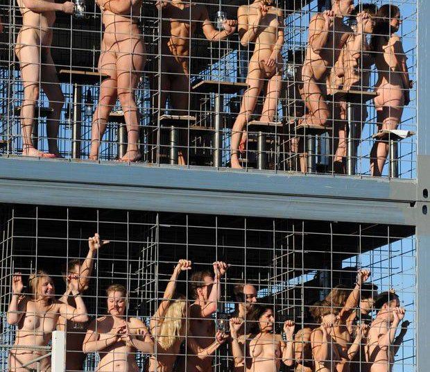 Um grupo de homens e mulheres posou nu dentro de gaiolas no sábado (14) durante o festival de inverno Tollwood, em Munique, na Alemanha. O objetivo do artista Wolfgang Flatz era fazer uma crítica à criação de animais em gaiolas.
