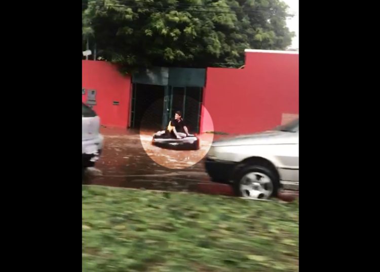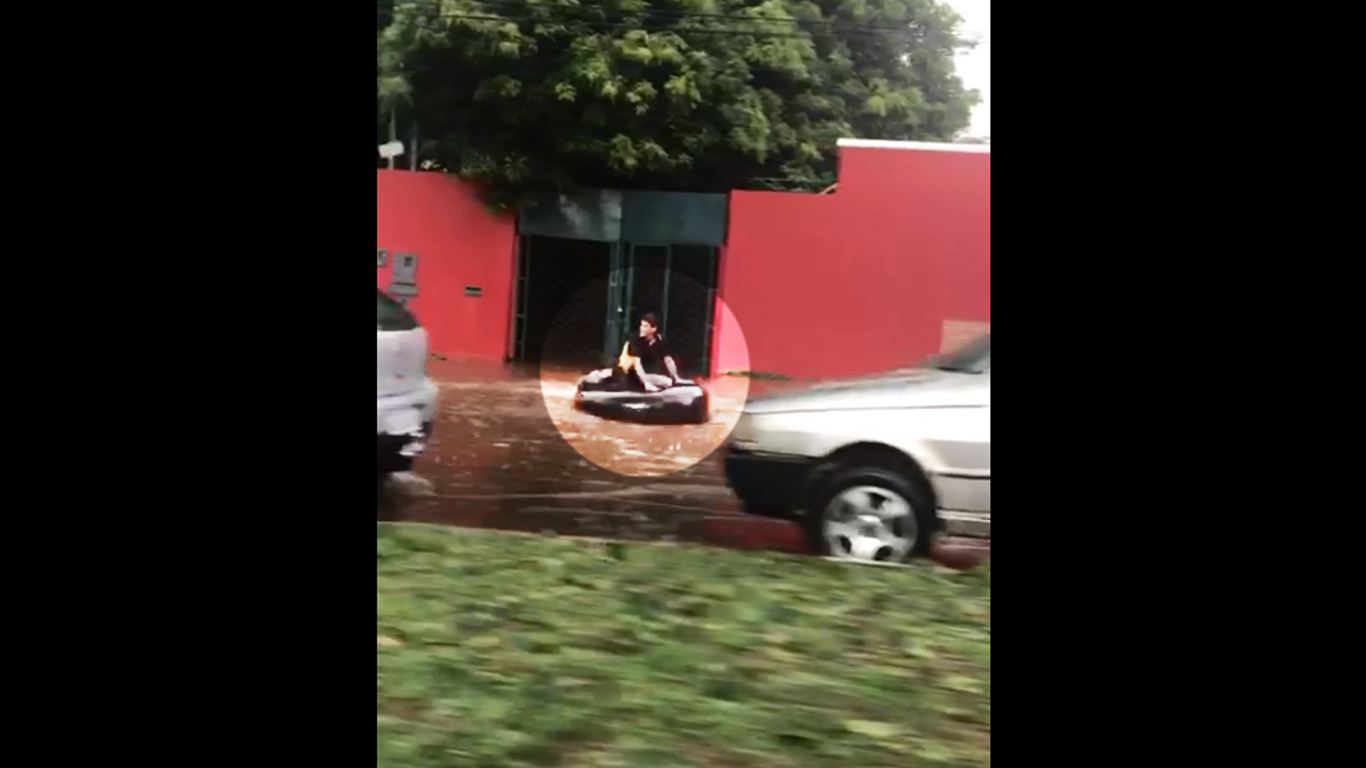 Um dos vídeos, porém, chamou a maior atenção. Isso porque ele mostra um rapaz “navegando pela correnteza” da forte enxurrada em cima de uma boia. Ele trafega tranquilamente pela Avenida Pedro Ludovico Teixeira, no Jardim Vila Boa, em Goiânia.