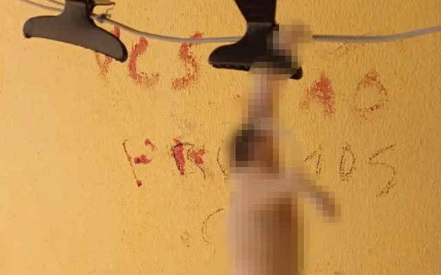 Após praticar a crueldade, o homem teria pendurado um dos filhotes no varal da casa e escrito na parede com o sangue dos animais: “O sangue deles não deu de vcs vai dá (sic)”.
