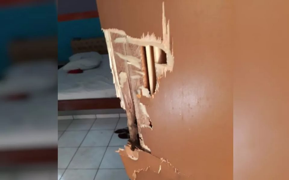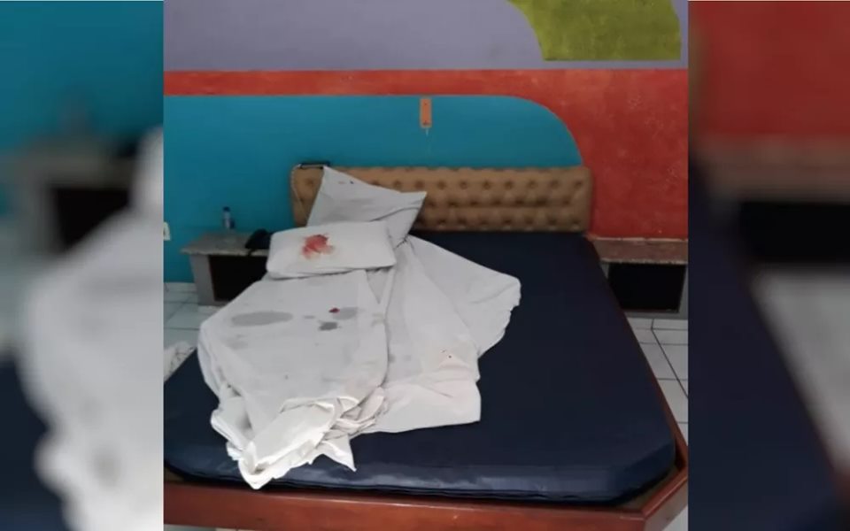 A vítima, localizada pela PM no chão da suíte usando apenas uma calcinha, foi socorrida pelo Corpo de Bombeiros.
