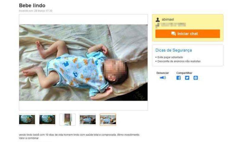 A postagem incluía cinco fotos do bebê e relatava que o valor da venda poderia ser combinado. A descrição feita pelo anunciante, identificado Abimael, dizia “Vendo lindo bebê com 10 dias de vida homem lindo com saúde total e comprovada. ótimo investimento. Valor a combinar”.