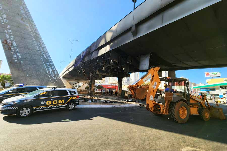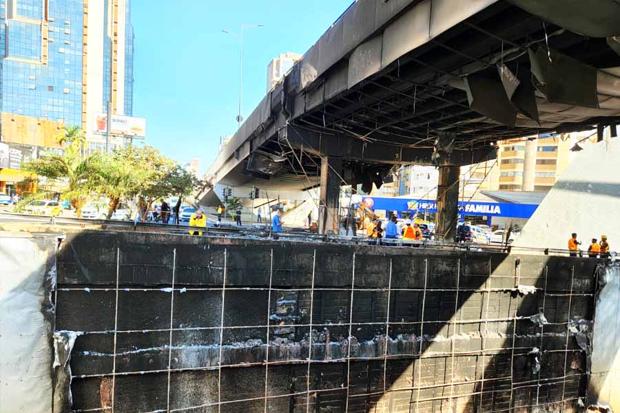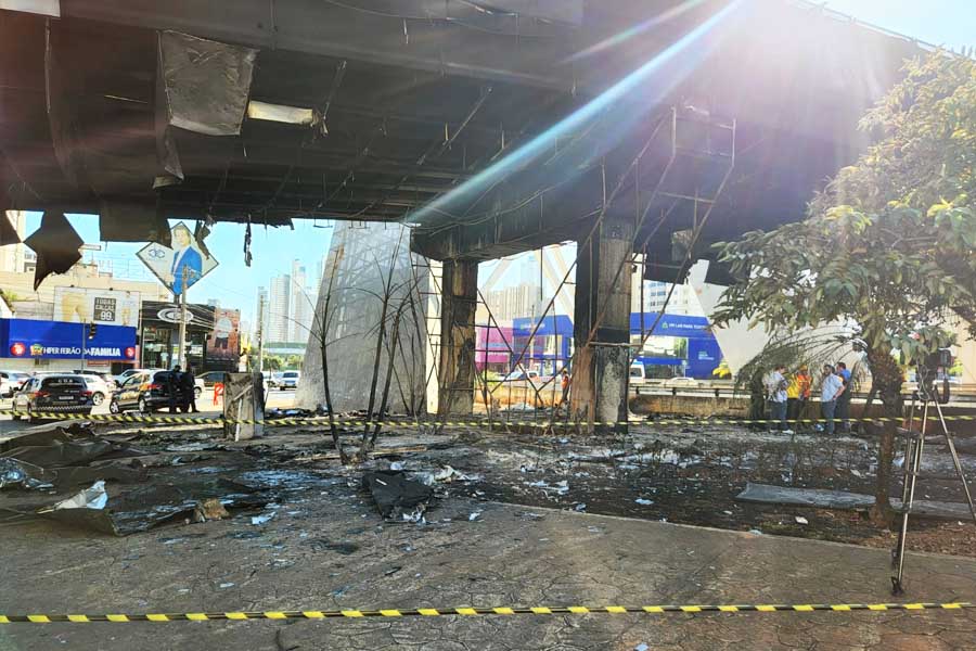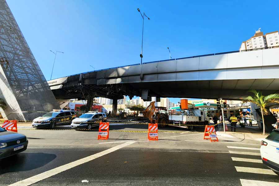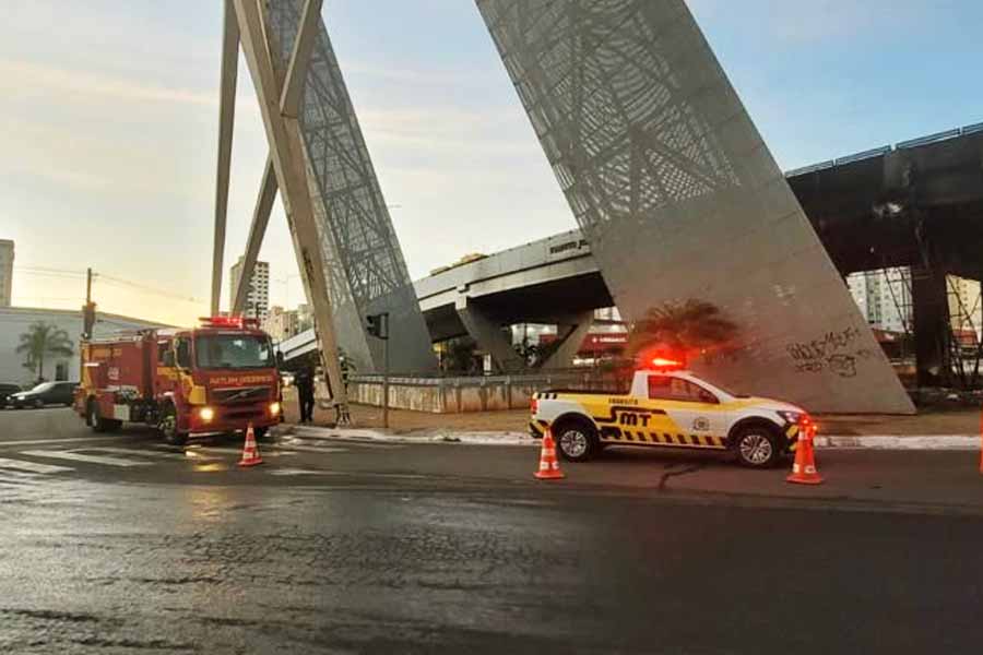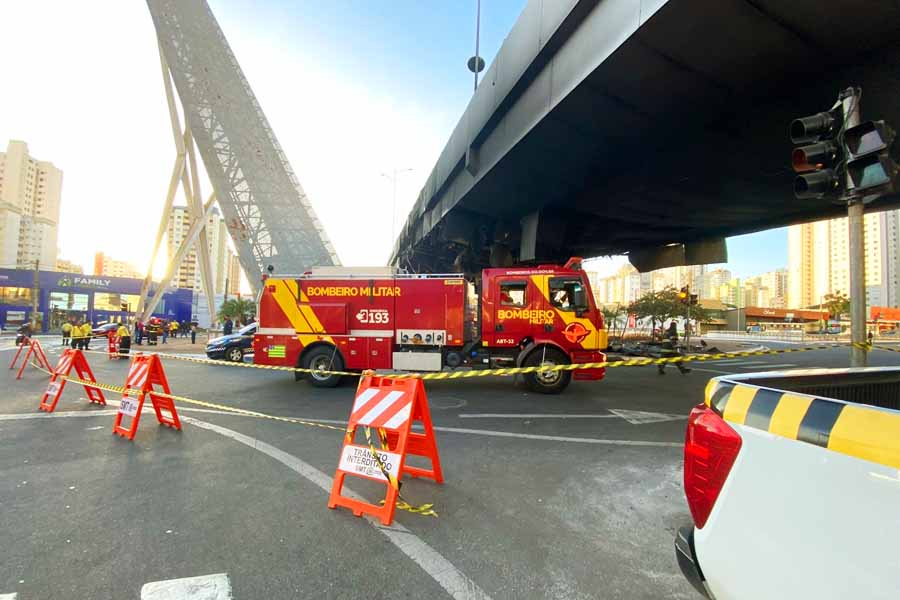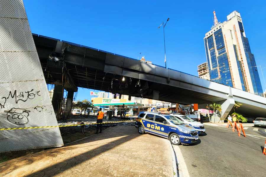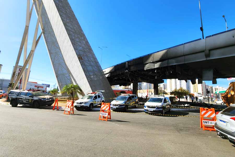 Investigações preliminares apontam duas principais suspeitas da causa do incêndio que atingiu o viaduto João Alves de Queiroz, na avenida T-63, em Goiânia, no início desta 6ª feira (15).