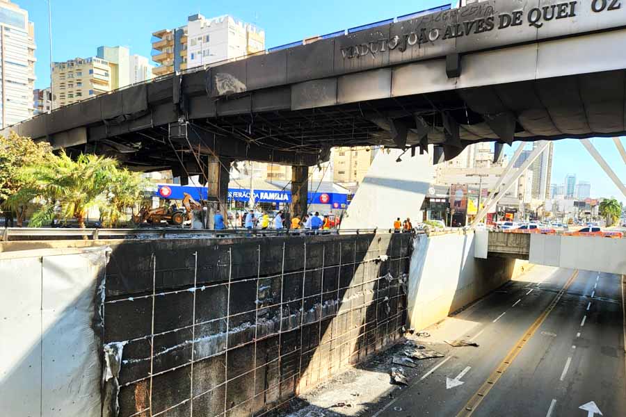 Investigações preliminares apontam duas principais suspeitas da causa do incêndio que atingiu o viaduto João Alves de Queiroz, na avenida T-63, em Goiânia, no início desta 6ª feira (15).