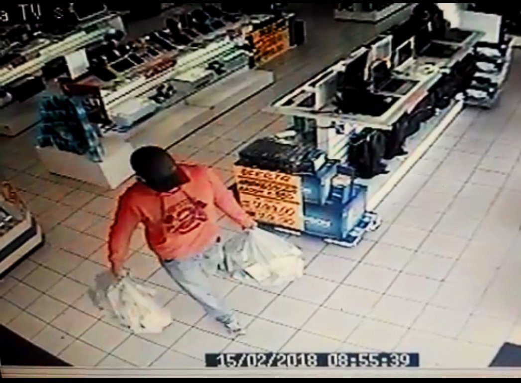 Nas imagens, é possível ver um dos ladrões com as duas mãos cheias de sacolas com caixas, aparentemente de equipamentos eletrônicos.