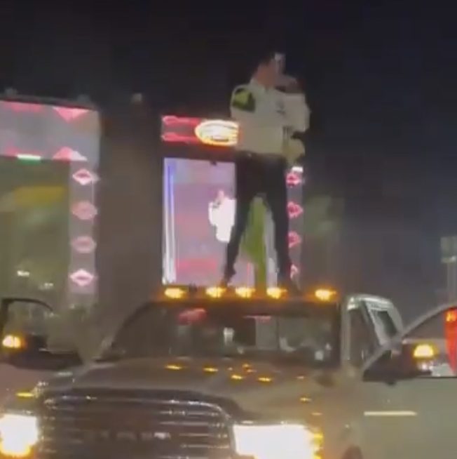 Durante sua apresentação, ele ficou em cima de uma caminhonete Dodge RAM branca.
